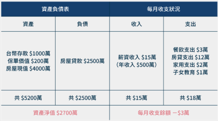 對立鴻而言,雖然月收入$15萬,再加上誘人的分紅獎金,年收入高達$500萬以上,這卻沒有讓立鴻感覺自己變得富有...每個月需要繳兩間房子高達$12萬的房貸支出,再加上基本的生活開銷及子女教育費合計$6萬,每個月支出為$18萬,皆為透支的狀況。除此之外,立鴻為家中主要經濟支柱,因此他幫自己規畫了許多保險,加上家人的保險,立鴻每年需繳將近20張的保單,每年光保費支出就高達$70萬!這也讓立鴻每次在要繳保費時,壓力非常大,從來都沒有覺得自己有錢...